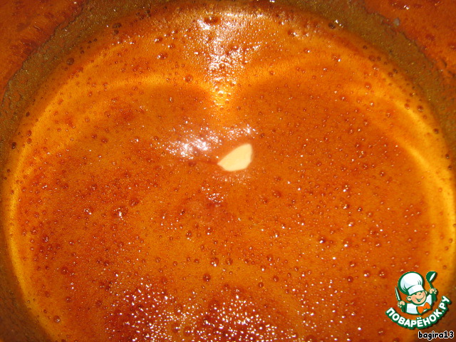 Для этого 6 ст. л. меда доведем до кипения. Затем добавим 2 стак. сахара, 6 ст. л. воды, 3 ч. л. соды (без горки), щепотку соли и будем варить, пока масса не приобретет яркий коричнево-оранжевый цвет.