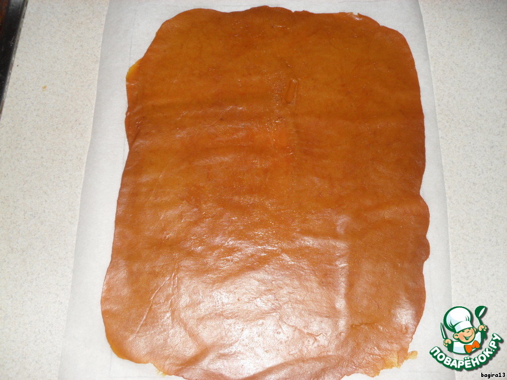 Выпекаем в нагретой до 200 градусов духовке около 8 минут. Пока корж горячий, снимаем с него бумагу для выпечки.