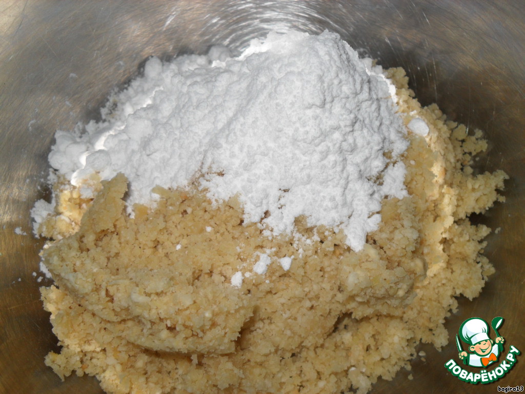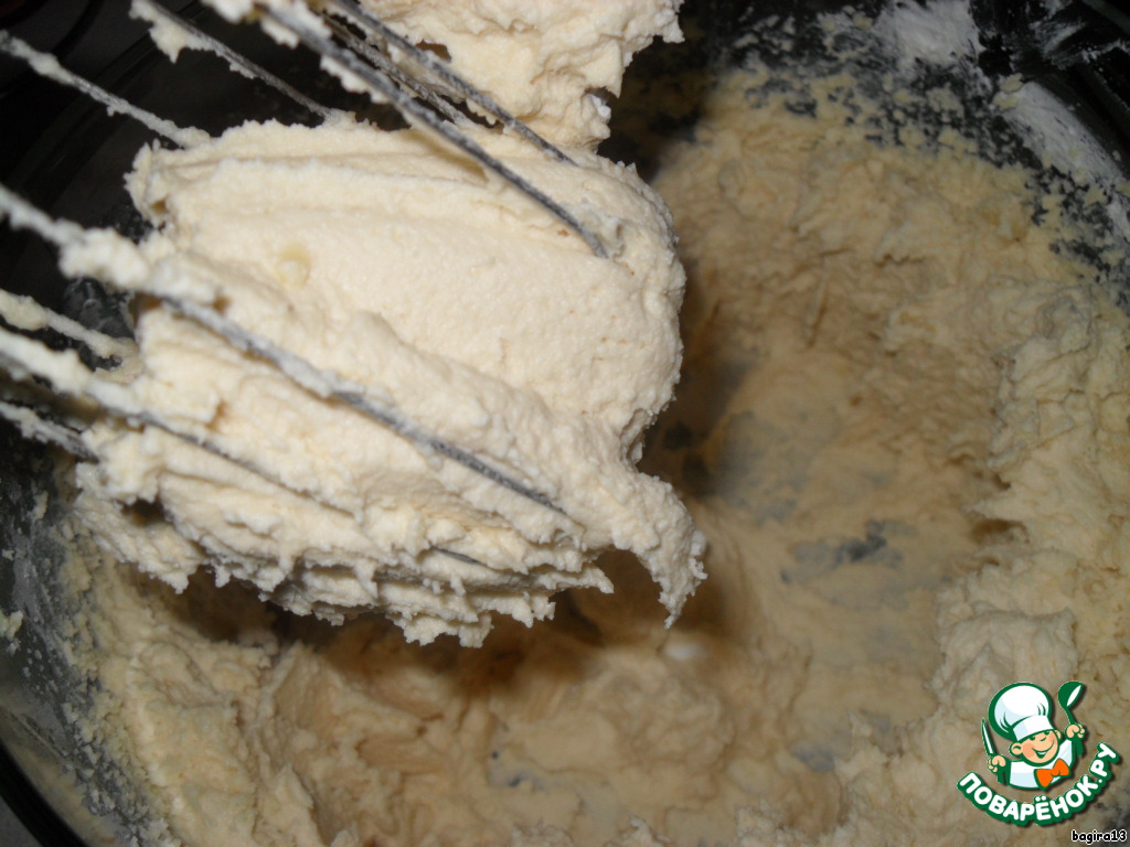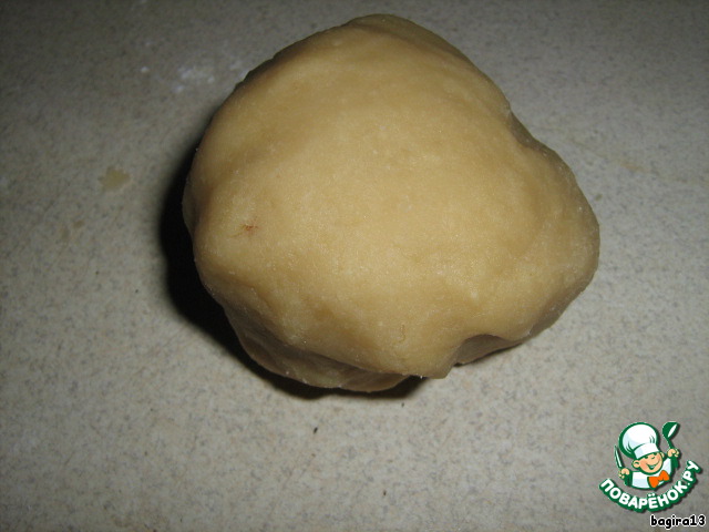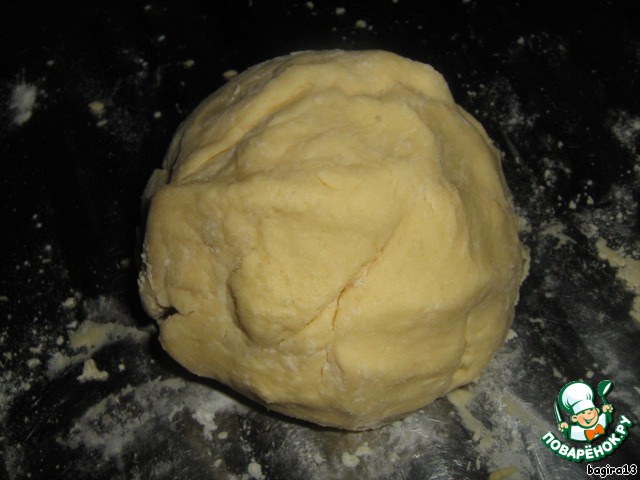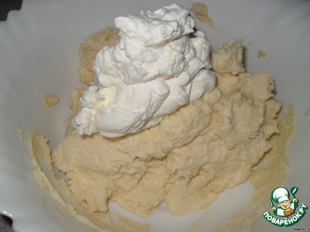 400 г мягкого маргарина смешать с 200 г сахара, затем добавить 4 желтка и 600 г муки с 2 ч. л. разрыхлителя (без горки). -
