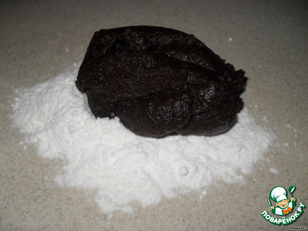 Итак, вскипятить 50 мл воды, щепотку соли и 25 г сливочного масла. После закипания добавить 50 г муки и 2 ч. л. какао. Снять с огня, хорошо перемешать, затем по частям ввести 150 г сахарной пудры.