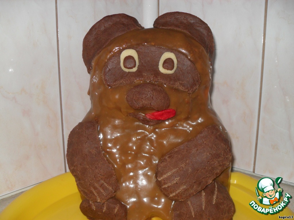Теперь про глазурь из ирисок и злую шутку... Так, как глазурь довольно скользкая, то через некоторое время крем, отсаженный шприцем начал съезжать с округлых форм Винни-Пуха, за исключением головы - там вся "шерсть" осталась на месте. Я пришла к выводу, что медведя лучше покрывать ганашем или масляным кремом, а уж после застывания крема делать ему прическу :-D.