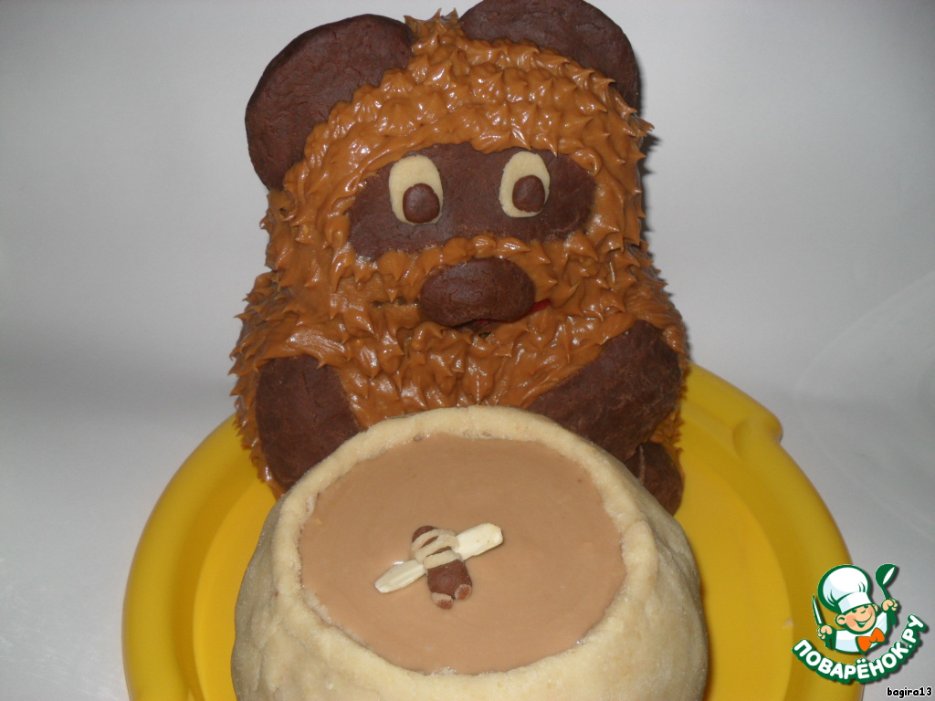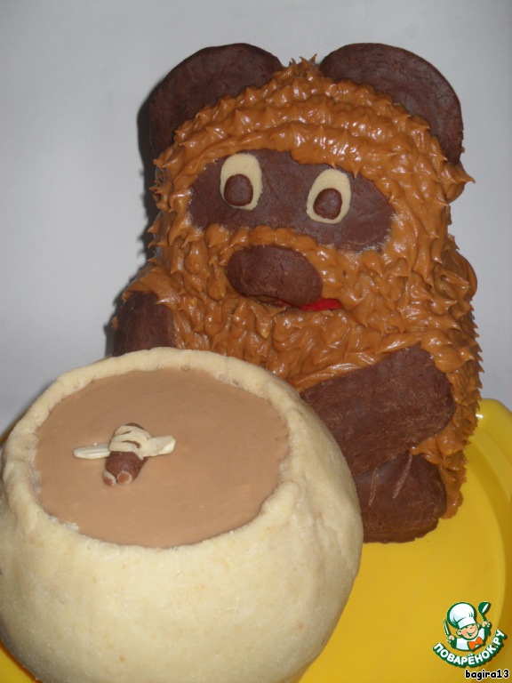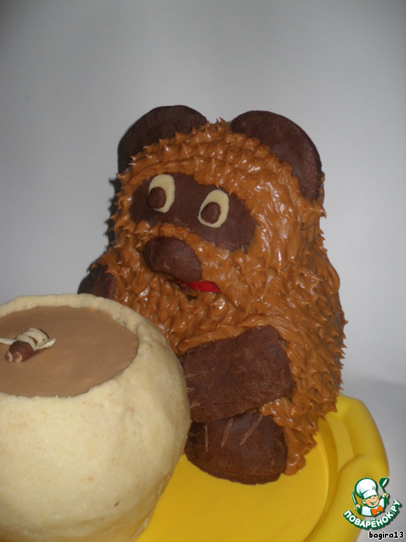 200 г сливочного масла взбить, добавить 1 банку вареной сгущенки и полученным кремом с помощью кондитерского шприца и насадки "звездочка" покрываем всего Винни-Пуха, тем самым имитируя его шерстку.