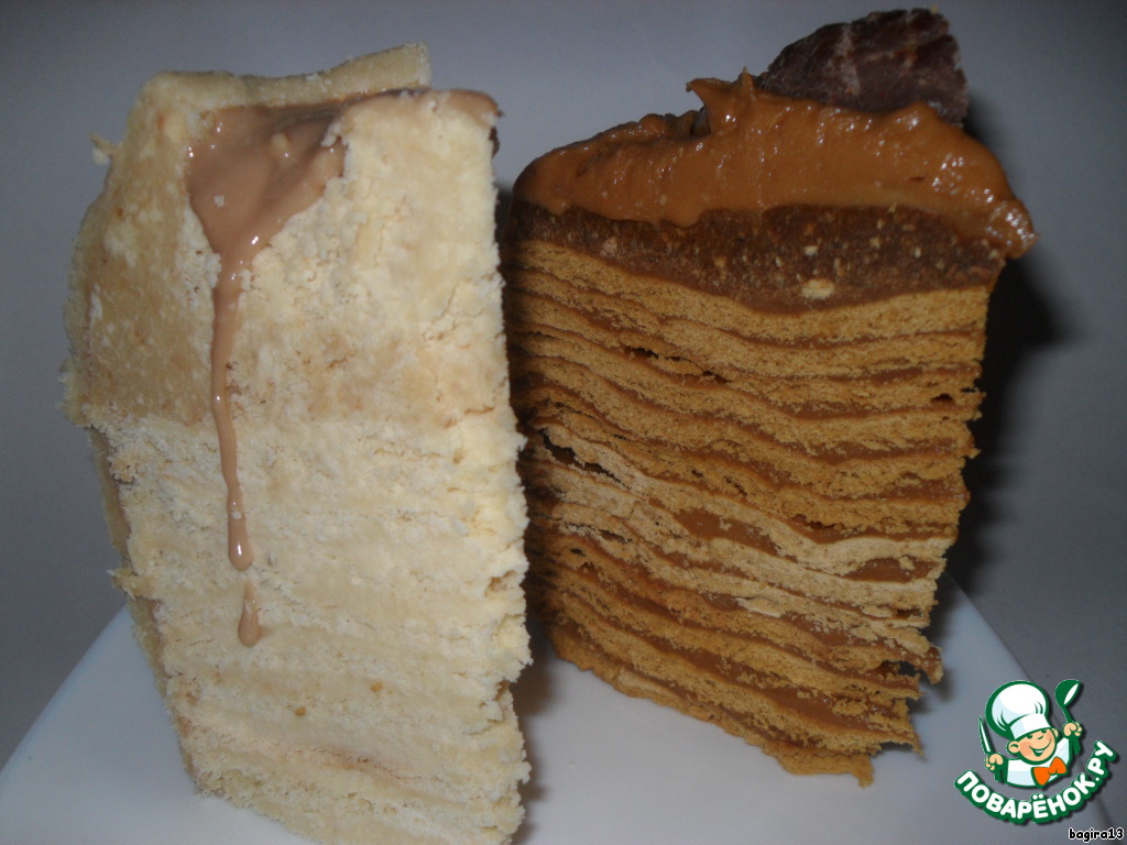 Вот разрез: медовик с насыщенным карамельно- медовым вкусом и мягкий пропитавшийся песочный торт с медовым кремом.