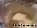 Смешиваем муку с разрыхлителем и добавляем к яично-сахарной массе, снова хорошо вымешиваем...
