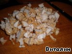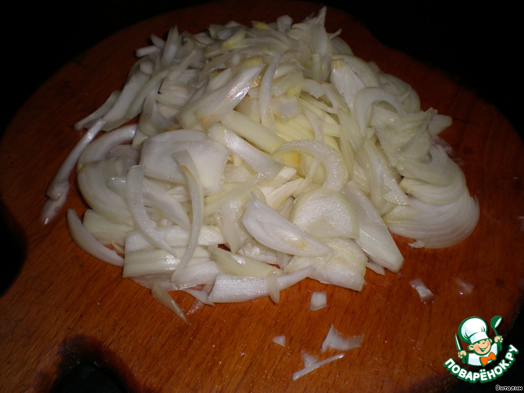 Лук режем крупно и маринуем 15 минут (вода, уксус, сахар).