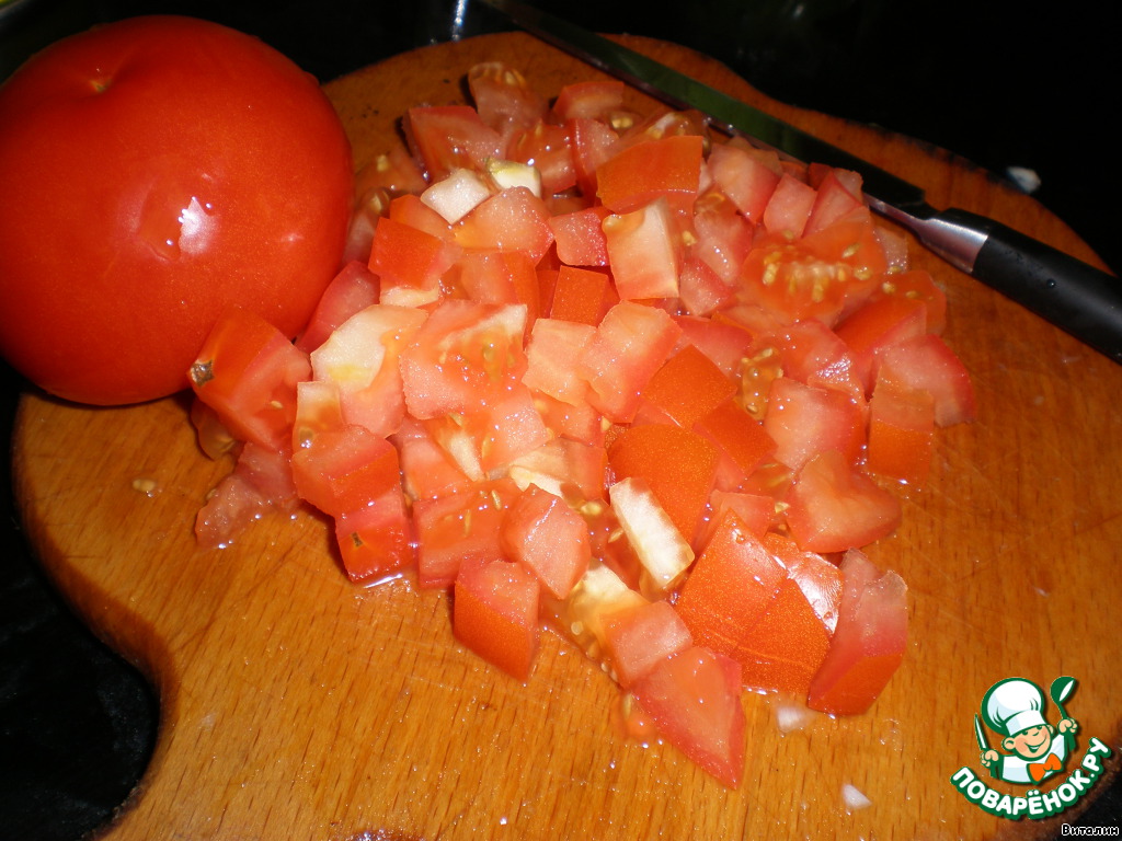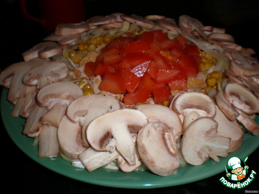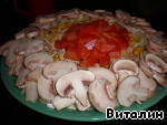 Затем лук и грибочки - все по кругу, по серединке - горочкой помидоры.