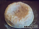 На слегка запеченном кругу из фарша сформировать круг с углублением.