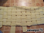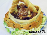 Пока запекается фарш, сплести из слоеного теста корзинку.