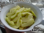 Яблоки (чем кислее, тем лучше!) очистить, удалить сердцевину и нарезать тонкими ломтиками. Можно сбрызнуть лимонным соком.