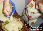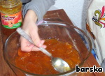 Дно огнеупорной формы смазать (тонко!) абрикосовым джемом или ОЧЕНЬ густым вареньем.