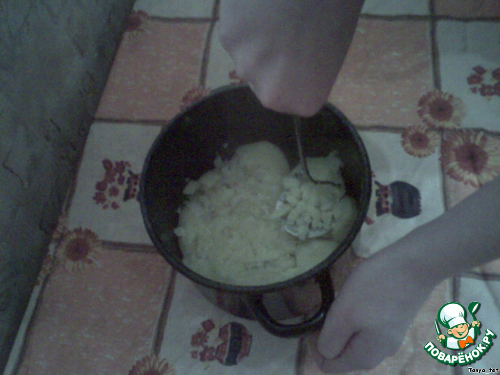 В это время у нас уже готова картошечка. Сливаем воду и толчем ее. Можно добавить сюда мелко порезанный укроп или другие приправы по вкусу.