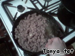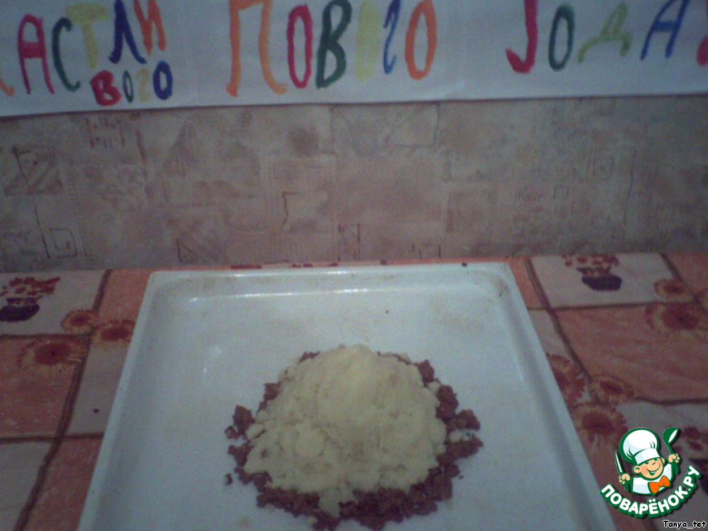 Берем противень или любую другую удобную форму. Выкладываем поджаренную половину фарша с луком.