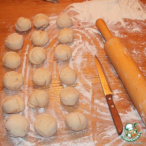 Катаем шарики размером с грецкий орех, даем расстояться вдвое (пока пирог печется).