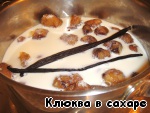 Очищенные каштаны складываем в небольшую кастрюльку, засыпаем сахаром и добавляем целые палочки ванили.