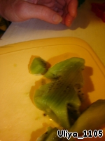 Делаем ёлочку (к сожалению, не смогла сфотографировать, попробую объяснить): киви чистим, кладем на бок и с двух сторон отрезаем выпуклости, только не много. Получился довольно-таки толстый брусочек. Намечаем на нем контур елочки формочкой для теста, а затем прорезаем ножом.
