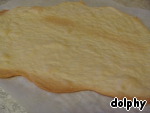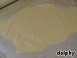 На листе бумаги для выпечки раскатайте одну часть теста в тонкий пласт (произвольной формы). Перенесите на противень. -