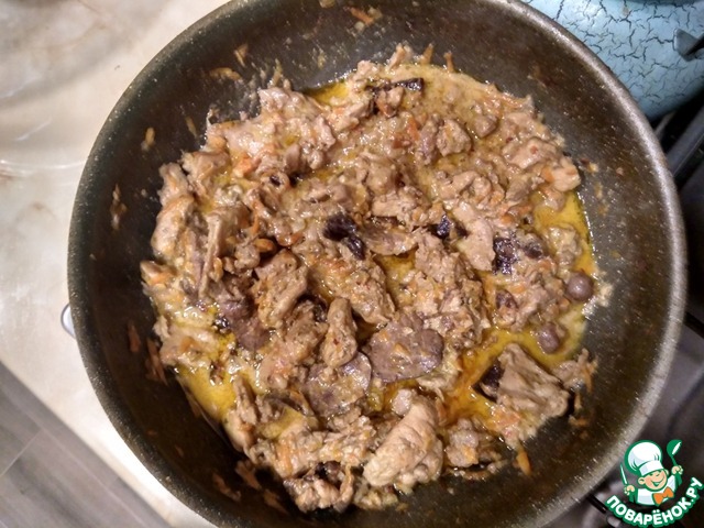 Мясо обжарить до легкой румяности в глубоком сотейнике, влить воды, чтобы она только-только покрыла мясо, и поставить тушиться где-то на полчаса.