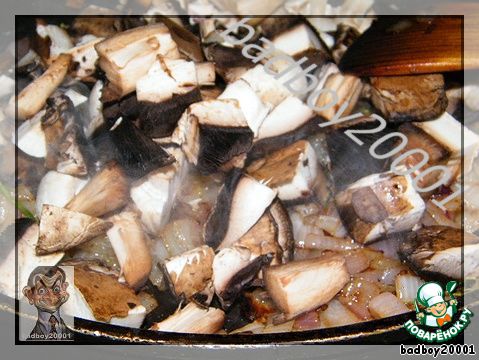 Жарим пару минут и кладем крупно нарезанные грибы.