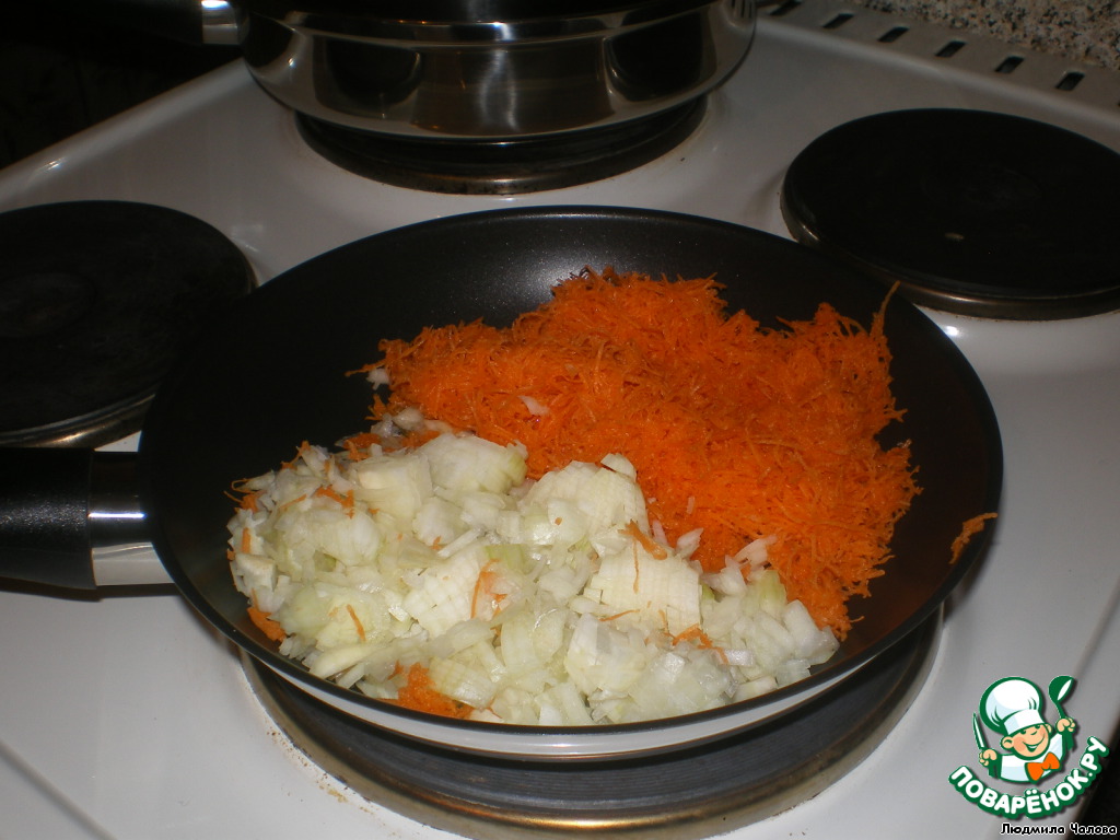 Нарезанный лук, мелко натертую морковь обжарить на растительном масле.