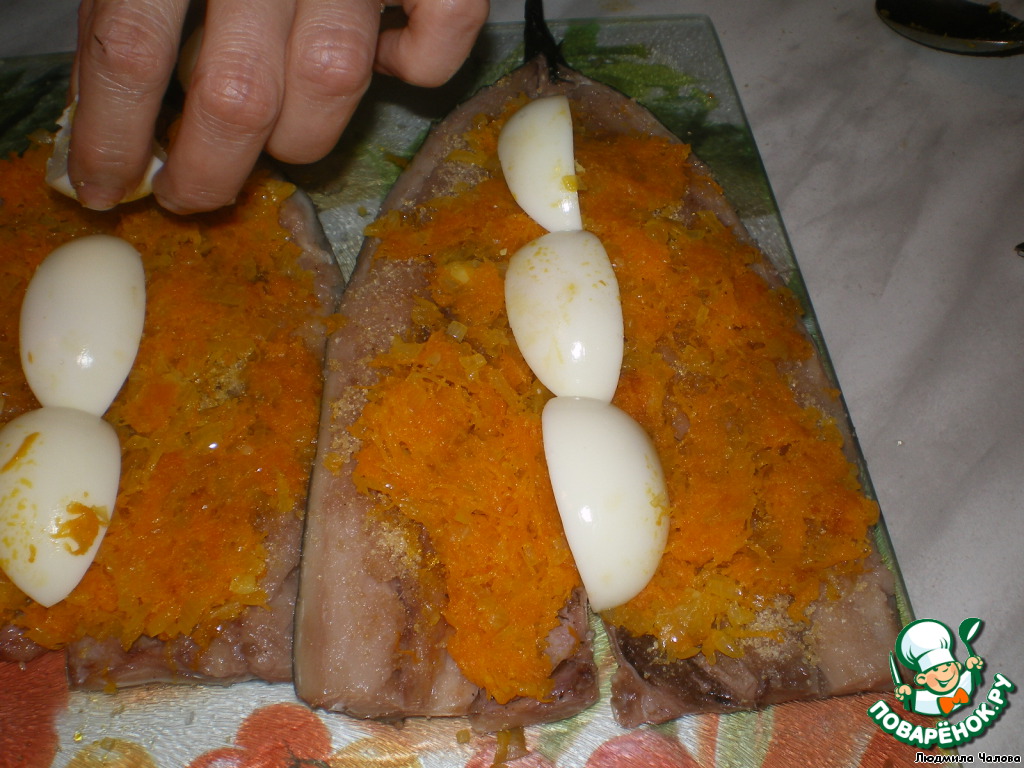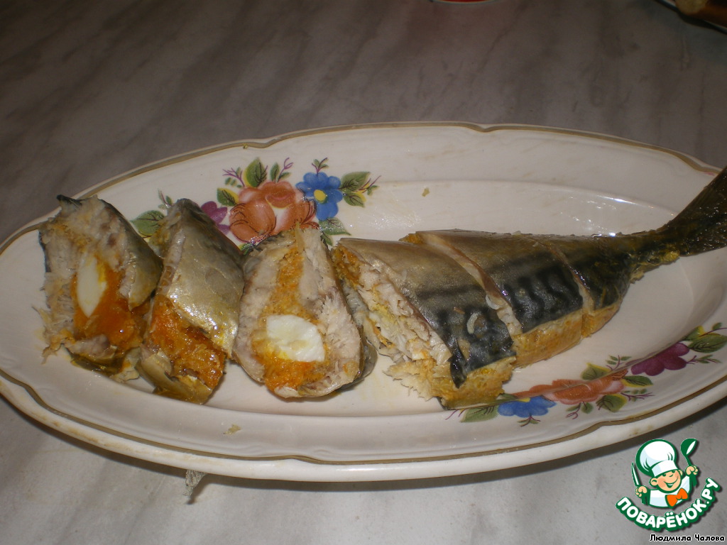 Скумбрию выпотрошить, промыть, удалить плавники, голову, хребет, поперчить, посолить, внутри посыпать желатином
