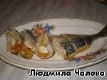 Охлажденную рыбу нарезать кусочками и подавать как холодную закуску. Но можно и в горячем виде!