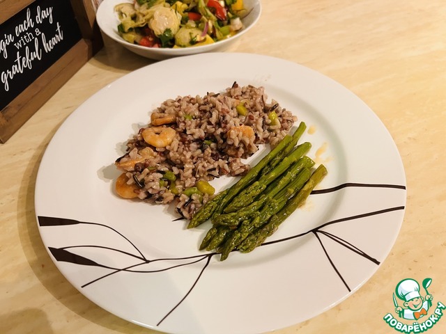 В сковороду к рису ввести креветки и спаржу, все перемешать и подать к столу.