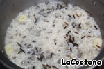 Честно прошла 4 супермаркета и не нашла рис для ризотто, пришлось готовить из смеси дикого и пропаренного. Варила рис 20 минут, добавила дольку чеснока, чтобы он стал более ароматным.