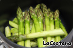 Очищенную спаржу положить в кастрюлю и залить горячей водой.