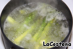 Когда спаржа закипит, дать ей повариться 2 минуты, снять с плиты и обдать ледяной водой.