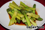 Выложить спаржу на тарелку и залить соевым соусом, чтобы она напиталась нежного и солоноватого сока.