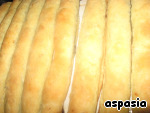 Готовые трубочки выложить на противень, а один волшебный клубочек надо оставить для того, чтобы выпечь из него ровный овал - для верха торта. Его мы выпекаем отдельно. Печем при t=180 градусов примерно 20 мин. до подрумянивания. Вот и трубочки готовы!