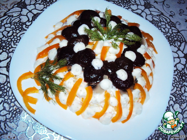 Верх салата украсить сливами, соломкой жёлтого перца и майонезом. Можно добавить немного зелени.