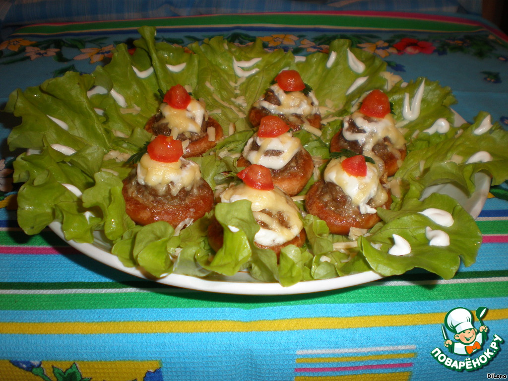 Выкладываем сушки с мясом на листья салата и украшаем зеленью. Шляпки гномиков сделаем из помидора. |