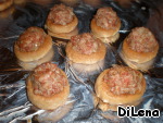 Начиненные сушки кладем на противень и запекаем в духовке, разогретой до 180 С, в течение 20-25 минут. За пять минут до готовности украшаем шарики майонезом и посыпаем тертым сыром. |