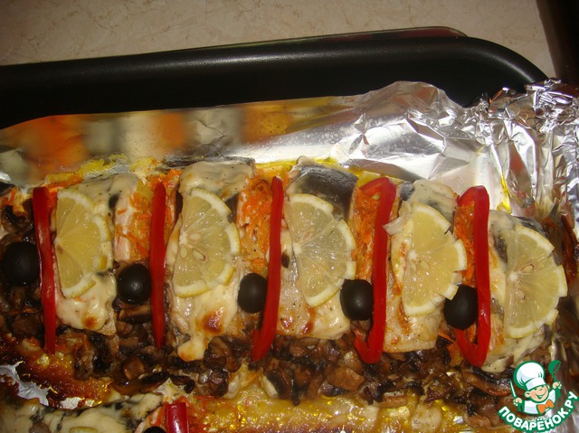 Каждый кусочек рыбки, начиная с головной части, обмакнуть в "заливку" и выкладывать на фольгу по порядку. Между кусочками рыбки выкладывать "прослойку", не жалея ее.