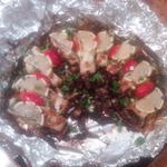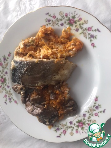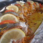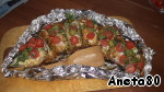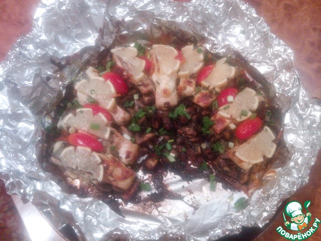 Остатками "заливки" полить кусочки рыбки сверху. Края фольги приподнять и завернуть наружу, придавая вид чаши. Поставить противень в духовку и довести рыбку до готовности.