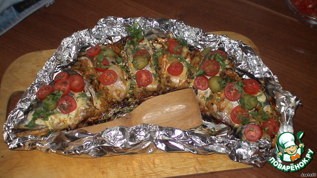 Готовую рыбу вынуть из духовки. Осторожно вместе с фольгой сдвинуть на большое плоское блюдо (я просто на разделочную доску сдвинула, не оказалось подходящего по размеру блюда). Теперь нашу Золушку надо принарядить к балу. Используем ломтики лимона, маслинки и полоски болгарского перца. Вот теперь наша Золушка превратилась в Королевишну!!! Пора на бал!!! Нас ждет принц!!!
