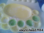 Для шариков я взяла детскую палитру, присыпала кукурузным крахмалом, скатала маленький шарик и положила его в лунку.