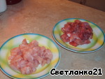 Куриное филе и телятину нарезать кубиками 1,5 см