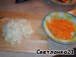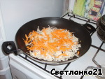 На оливковом масле обжарить капусту с морковью и половиной нарезанного лука