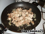 Филе курицы и телятину смешать с луком, обжарить на оливковом масле