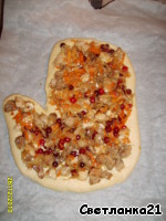 Из второй части сформировать такую же рукавичку и накрыть ею первую часть с начинкой. Из обрезков теста и клюквы вылепить украшения