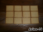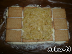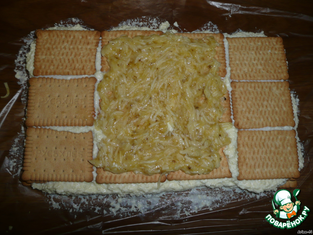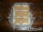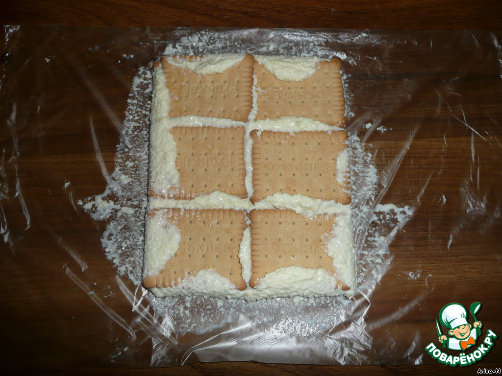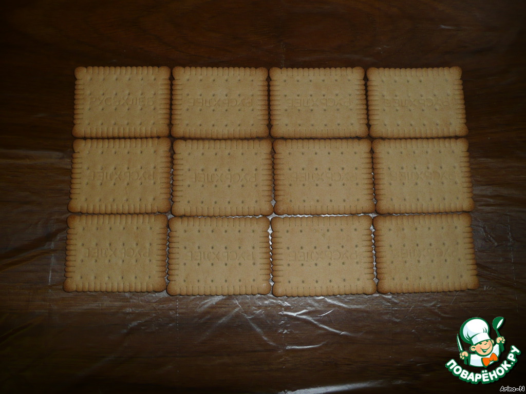 На полиэтиленовую пленку выложить печенье для крыши домика - прямоугольник 4 на 3 печенюшки. Нанести крем, снова выложить ряд печенья, крем... всего три слоя печенья -