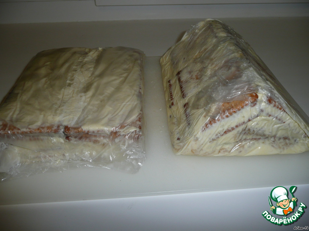 На пленку выложить печенье для основания домика - прямоугольник 2 на 3 печенюшки, нанести крем, печенье... всего 6 слоев печенья (если печенье осталось, можно и 7 слоев сделать), полученный корж заворачиваем в пленку