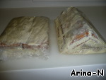 На среднюю часть так называемого коржа выложить банан, натертый на терке, добавить крем и с помощью пленки сформировать крышу домика