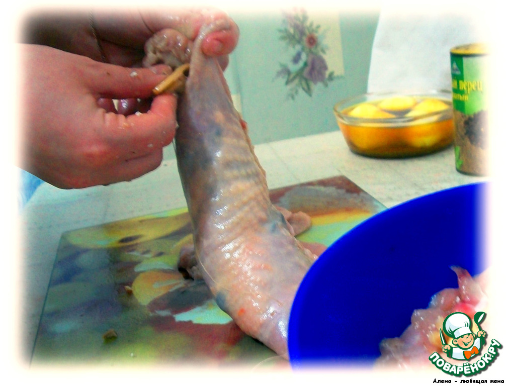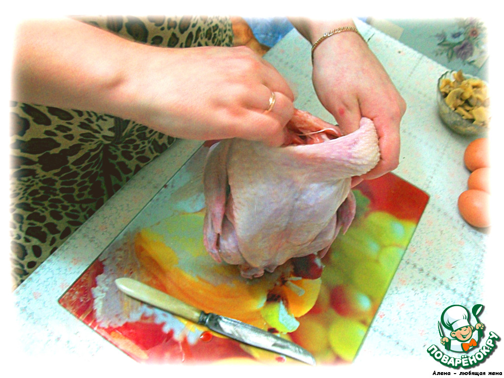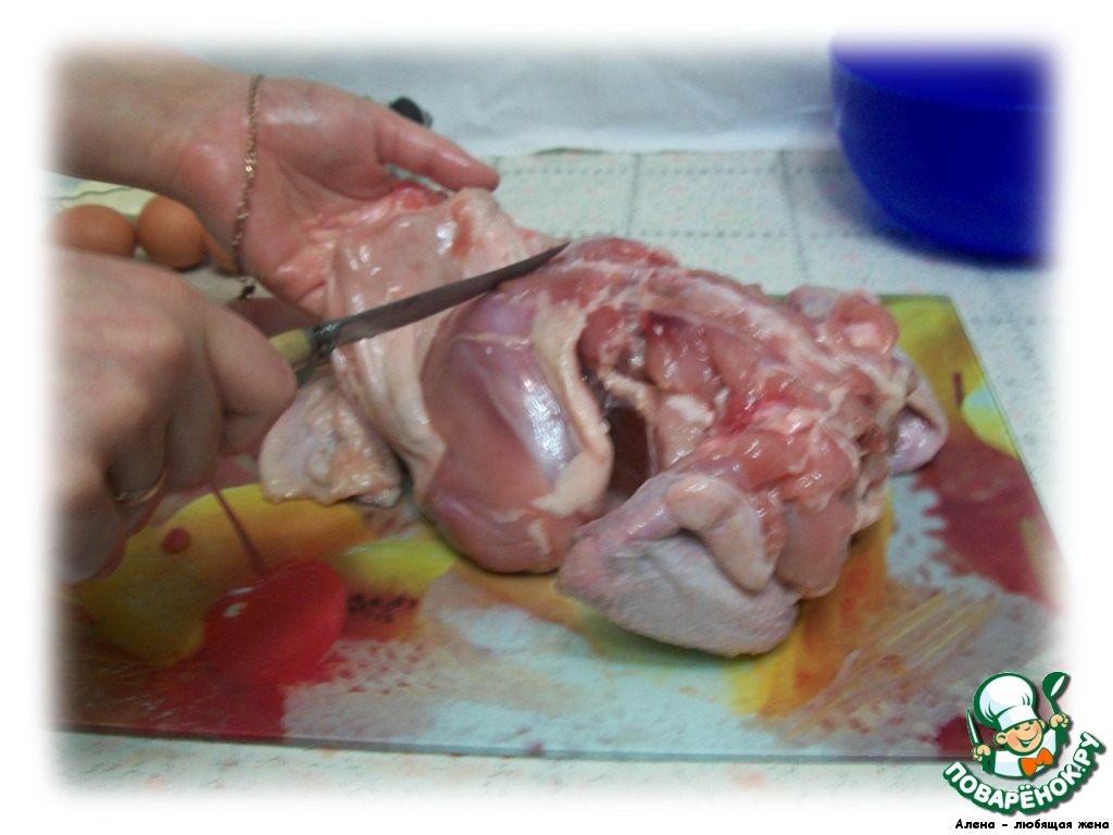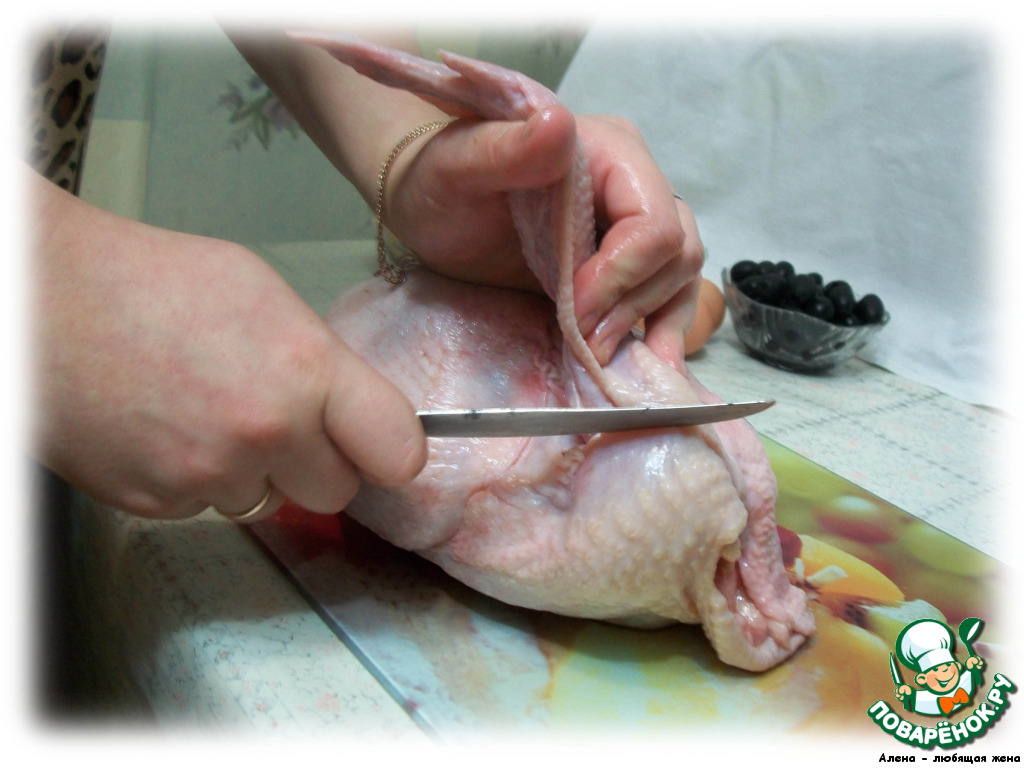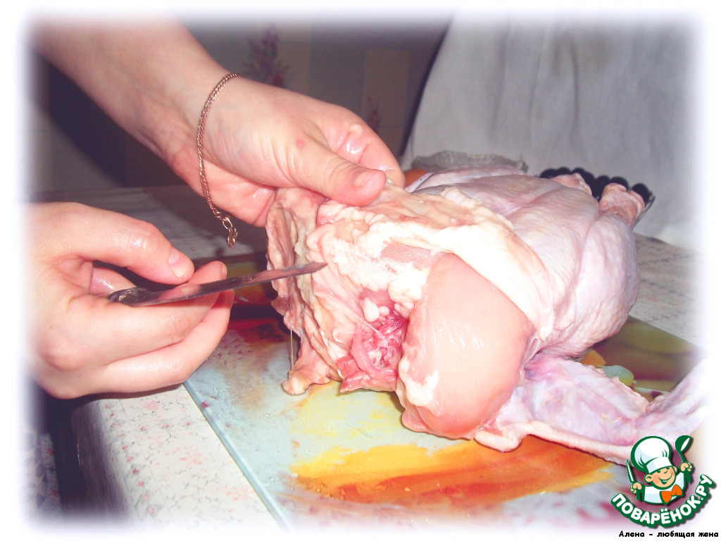 С курицы аккуратно снимаем кожу чулком, можно вырезать крылья для удобства