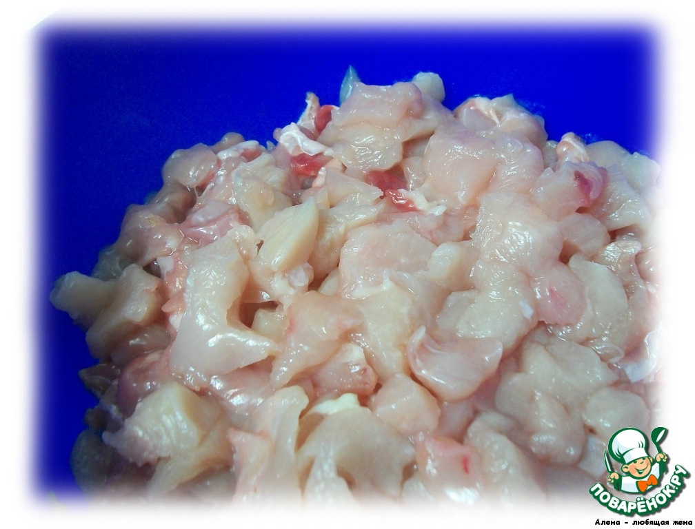 Теперь нам нужно срезать все мясо с курицы и нарезать его небольшими кусочками