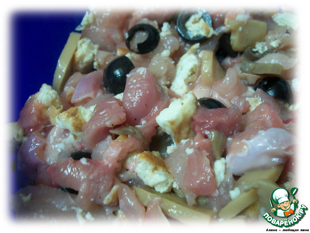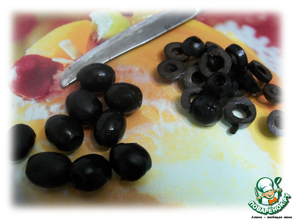Маслины тоже немного нарезаем, я режу не тонкими колечками