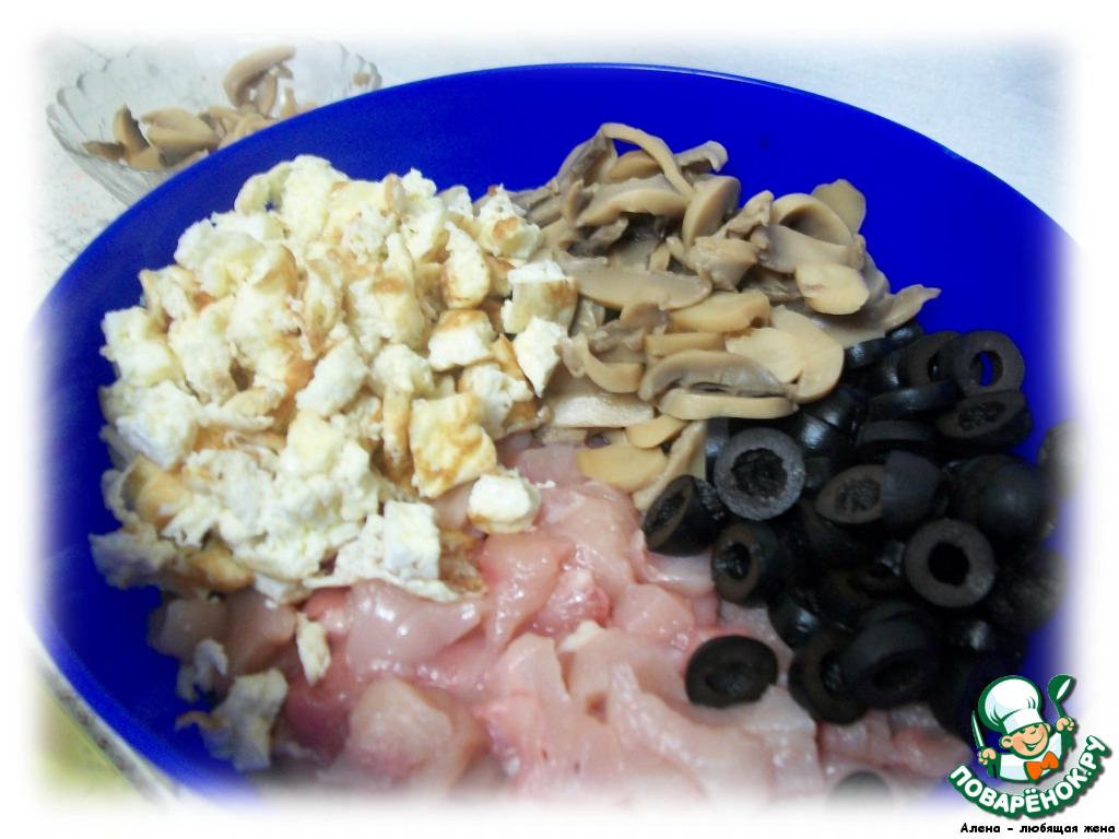 Соединяем остывший омлет, малины, курицу и грибы