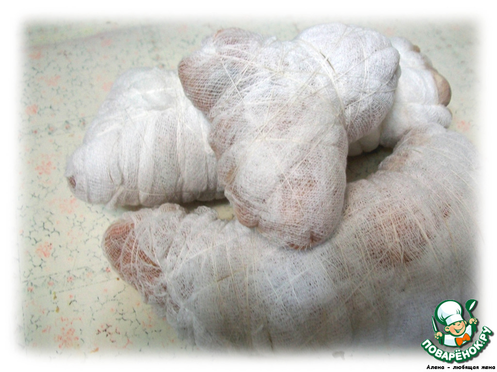 Каждый рулет обернуть марлей и туго обвязать нитками, это нужно, чтобы при варке наш рулет не разорвало. Рулеты закидываем в кипящую сильносоленую (немного меньше, чем на сало) воду и варим 50 минут